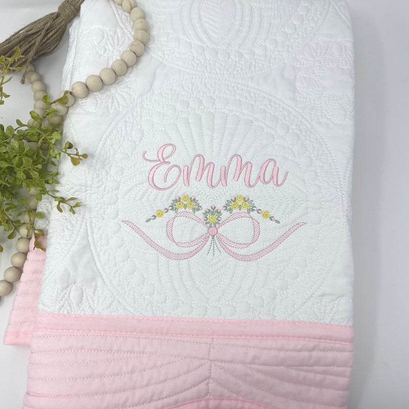 Personalized heirloom quilts make a cherished keepsake and add a touch of warmth to any home or nursery. Quilts are stitched with a beautiful intricate pattern with a scalloped edge. Made of soft 100% cotton and measure 36 x 46 inches, they are the perfect size for cribs or strollers and also make a wonderful lap quilt.